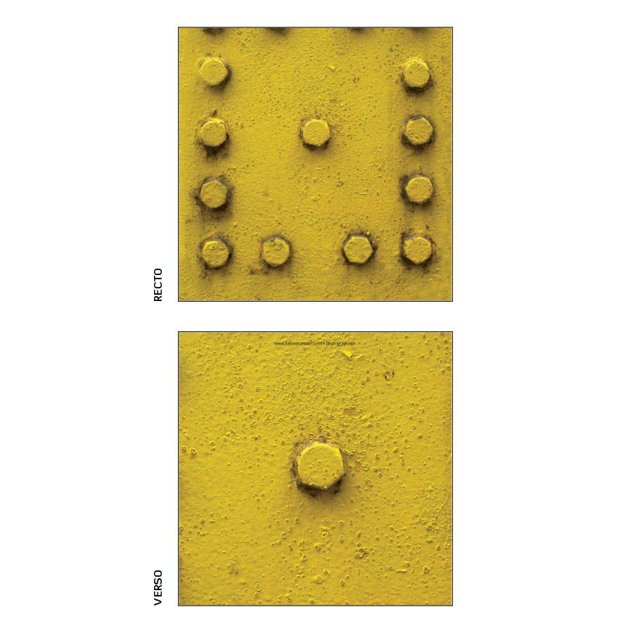 Une photo de matière abîmée de Sabine Sannier («Tête de pioche») est imprimée sur un papier épais en couverture et au dos, entrecoupée par la spirale métallique.