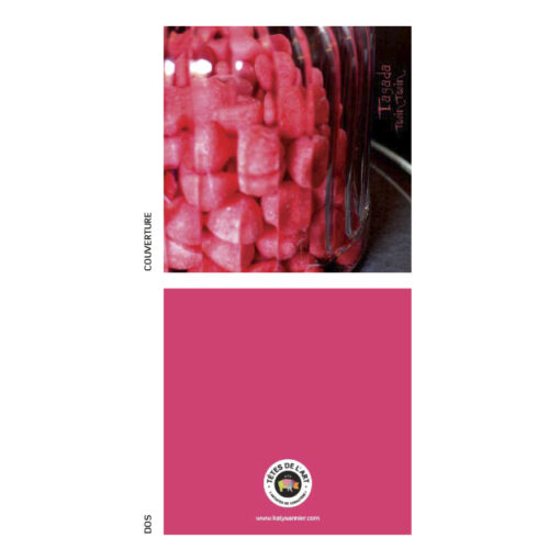 Une photo de Katy Sannier (« Tête au carré ») est imprimée au recto sur papier cartonné, le dos, cartonné également, est de couleur unie.