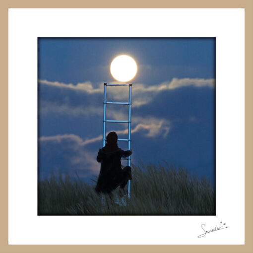Mini cadre « Echelle » de la collection « Jeux lunaires », une série de photos qui provient d’un projet personnel que Laurent Laveder et Sabine Sannier ont mené en commun. Ils scénarisent, préparent et réalisent ensemble cette série. Ce sont des trompe-l’œil poétiques et oniriques sur le thème de la lune. Ces photos sont réalisées sans trucage dans les dunes de Treguennec en Bretagne (Finistère).