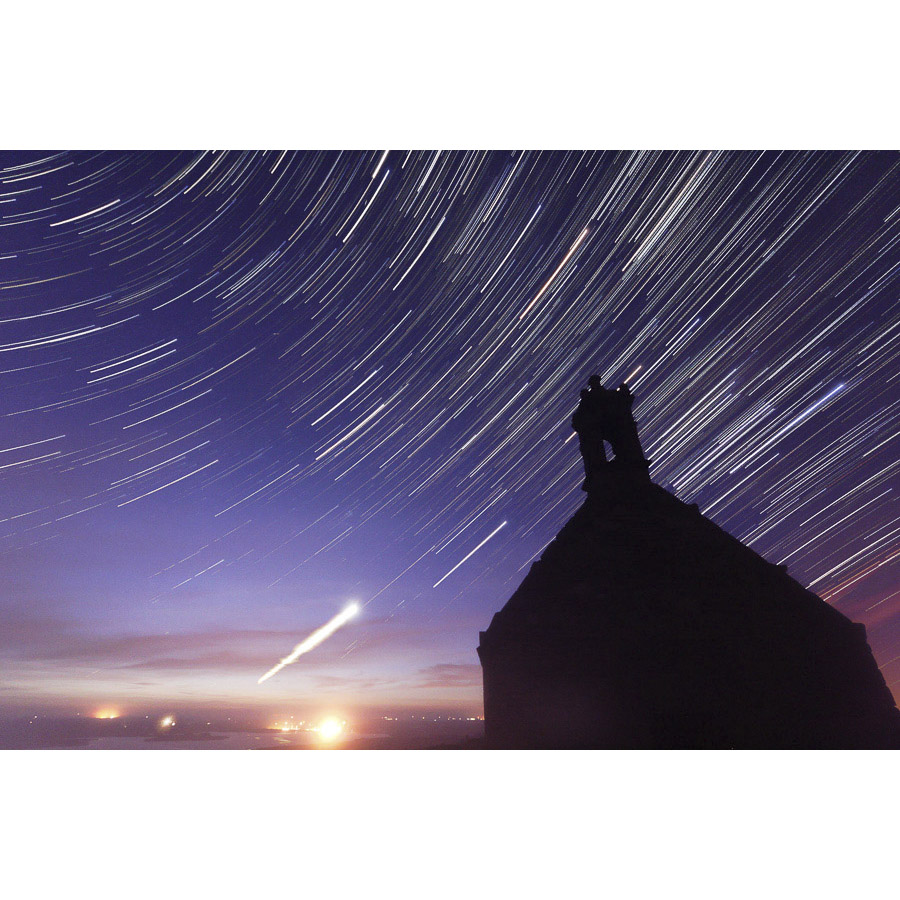 L’astre qui semble s’embraser est la planète Vénus, l’étoile du Berger, qui se lève dans le ciel de l’aube au-dessus du Lac de Brennilis, dans les Monts d’Arrée. La chapelle Saint Michel de Brasparts dresse son imposante silhouette dont le clocher masque en partie les étoiles de la constellation d’Orion.