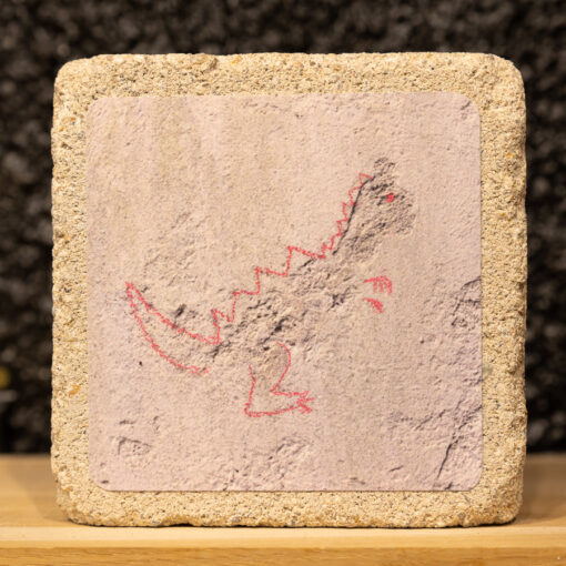 La photo « Dinosaure » est imprimée sur papier peint et collée sur un pavé de béton (13x13x5 cm) donnant ainsi l’illusion que le mur a été découpé sur place !