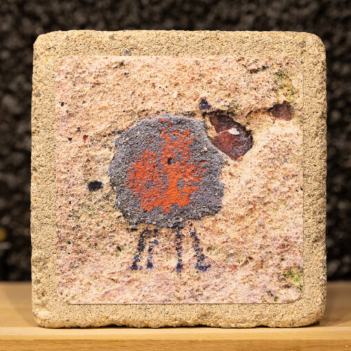 La photo « Mouton gris » est imprimée sur papier peint et collée sur un pavé de béton (13x13x5 cm) donnant ainsi l’illusion que le mur a été découpé sur place !