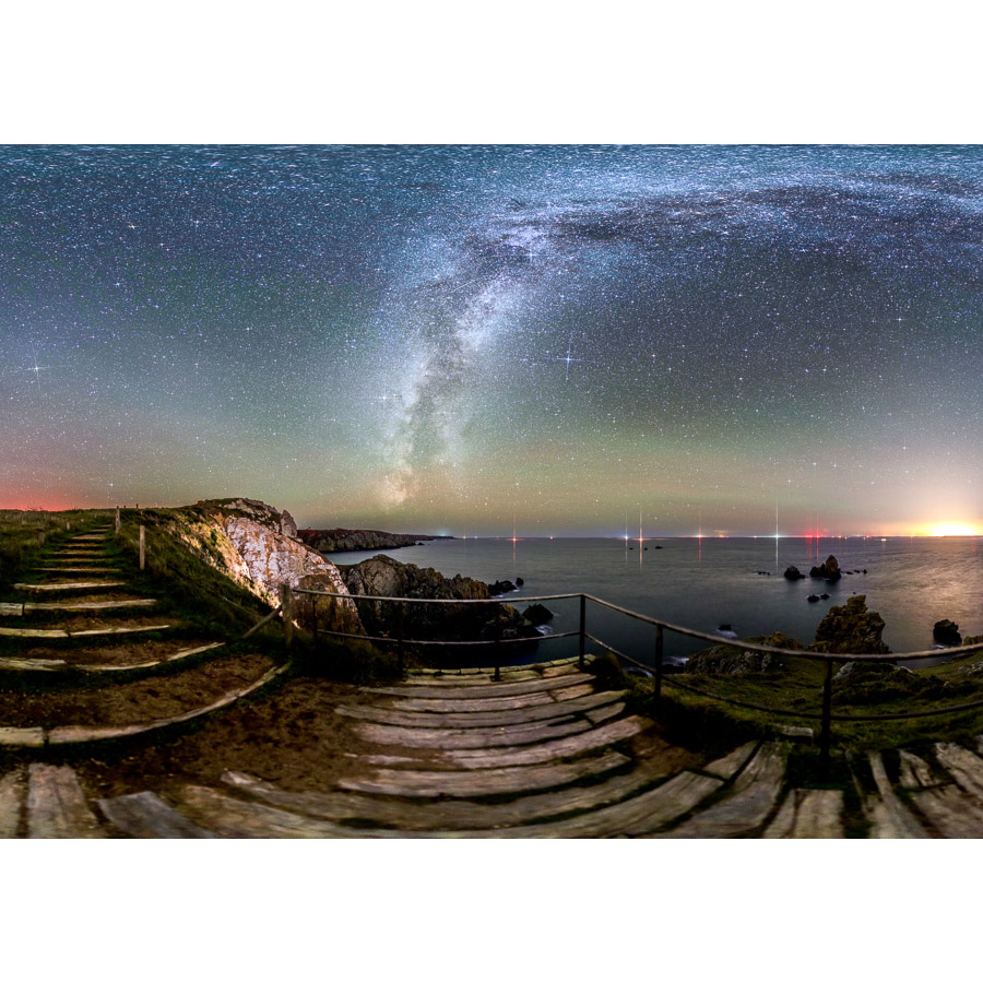 La Voie lactée se dresse au-delà du garde-corps qui protèges les randonneurs arpentant le GR34 dans la réserve du Goulien. Tout à droite, la ville de Brest déploie son halo lumineux et plus à gauche, quelques croix lumineuses trahissent des éoliennes (en rouge), des phares et quelques balises.