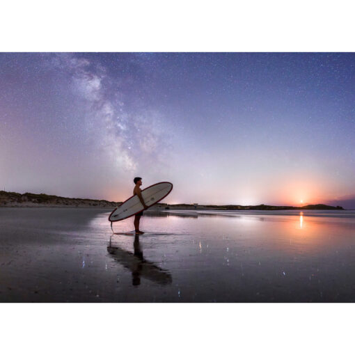 Photo “La Torche : Un surfeur face à la Lune » de la collection « Bretagne étoilée” au format A4 (21×29,7 cm) tirée sur papier photo mat.