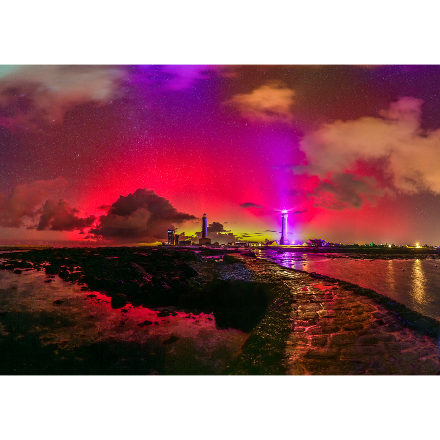 Le 19 janvier 2026, une puissante tempête solaire a engendré d’incroyables aurores boréales. La présence de nuages orne joliment le ciel. Et l’éclairage du phare qui change de teinte toutes les 2 s environ colore le paysage et les nuages de tons variés.
