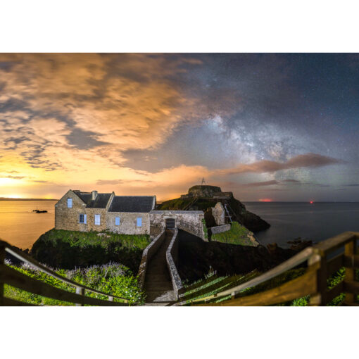 Photo “Plougonvelin : Le Fort de Berthaume, des nuages et la Voie lactée » de la collection « Bretagne étoilée” au format A4 (21×29,7 cm) tirée sur papier photo mat.
