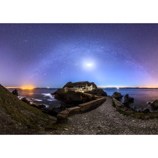La Lune en Croissant illumine tout le paysage , mais pour bien voir le Fort des Capucins en contre-jour, j’ai éclairé les bâtiments à l’aide du flash de mon smartphone déposé au pied des constructions. L’arche de la Voie lactée relie la ville de Camaret-sur-Mer (tout à gauche) à Brest (extrême droite). Ces lumières chaudes aux extrémités réchauffent agréablement cette photo.