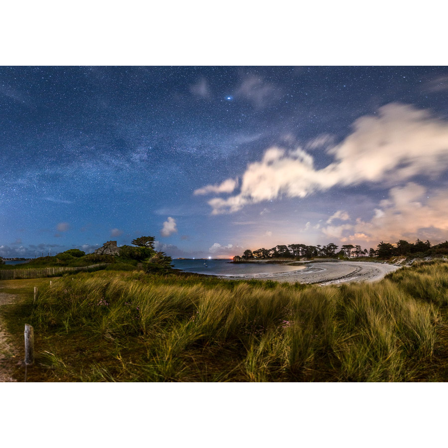 Une jolie plage de sable bordée d’hoyas est située tout au bout de la Pointe de Perharidy. Dans un ciel bleuté, une partie de la Voie lactée est visible, masquée par des nuages éclairés par les teintes chaudes des lampadaires des villes et par la lumière blanche de la Lune qui illumine aussi le premier plan.