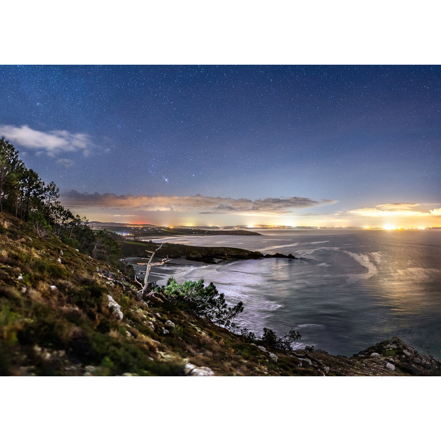 La constellation d’Orion se lève au-dessus des plages de Trez Bihan, de Trez-Bellec et de Pentrez. Tout à droite, les lumières de Douarnenez illuminent les flots de la Baie du même nom. J’ai illuminé l’arbre mort pour qu’il soit bien visible. Autrement, il serait sombre sur fond sombre. A l’horizon, on aperçoit de gauche à droite : le halo rouge des éoliennes de Cast, Plonévez-Porzay, Locronan, et le halo de Quimper.