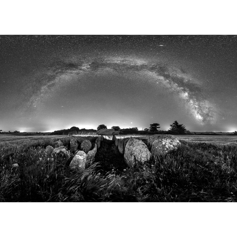Étiquettes : allée couverte, allée couverte de kerugou, bretagne, finistère, menhir, noir et blanc, pays bigouden, photo à encadrer, plomeur, voie lactée