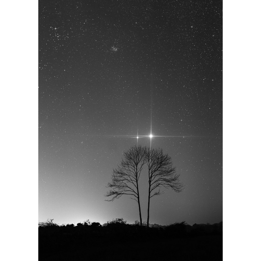 Étiquettes : arbres, bretagne, conjonction, jupiter, noir et blanc, nuit, paysages, photo à encadrer, pluguffan, vénus
