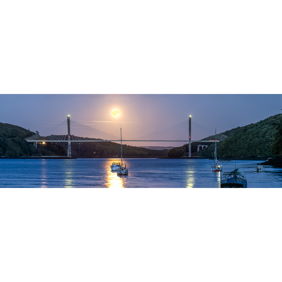Installé en aval de l’Aulne, je contemple vers l’est le lever de la Pleine Lune derrière le Pont de Térénez. Quelques bateaux mouillent dans les eaux calmes de la rivière.
