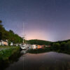 Vue sur le phare du Coq et la côte opposée de Sainte-Marine. La plage est joliment illuminée par les lampadaires à LED situés plus loin dans mon dos sur ma droite La Voie lactée passe derrière la phare.