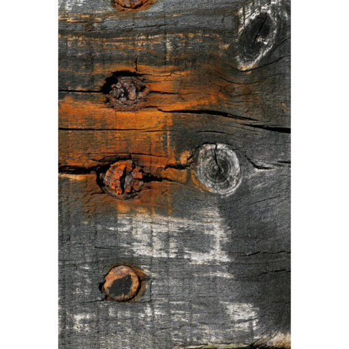 Tirage photo « Bois brûlé clou orange » au format 50×66 cm contre-collée par nos soins sur support Medium 10 mm.