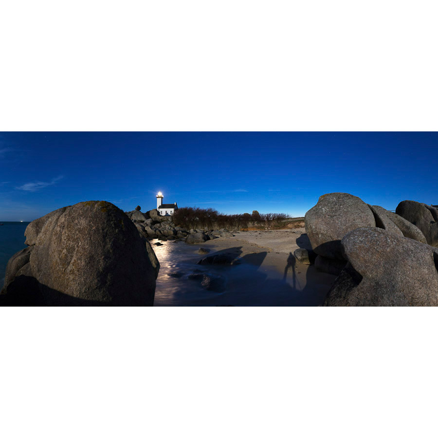 Installé parmi les rochers de la Pointe de Pontusval, un astrophotographe fige la scène éclairée à la lumière de la Pleine Lune.