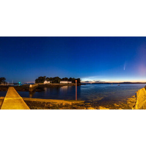 En ce petit matin de la mi-juillet, la comète Neowise est bien visible en direction du nord-est, soit à droite de l’Île Tristan vu depuis la corniche de Douarnenez. Les 7 étoiles de la Grande Ourse sont situées à la verticale de l’île. Le premier plan est orange à cause des lampadaires de la corniche mais les bâtiments en face sont plus blanc car Tréboul est pourvu de nombre de lampadaires à LEDs blanches. Notez les nuages à la texture fine situés entre l’île et la comète : il s’agit de nuages noctulescents, un type de nuée de très haute altitude (85 km !) parfois visible (entre main et juillet) au crépuscule tard le soir ou tôt le matin.