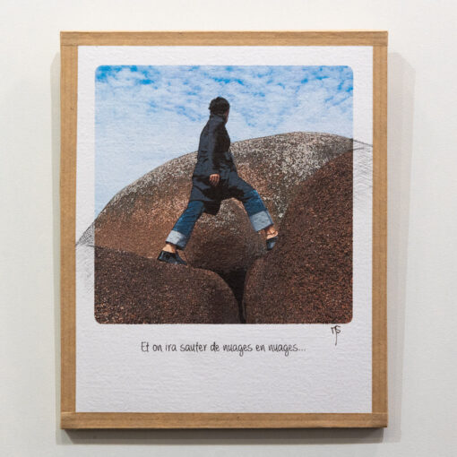 Cadre « Et on ira sauter de nuages en nuages » de la collection “Et on ira…” présenté dans un style polaroïd 14×17 cm.