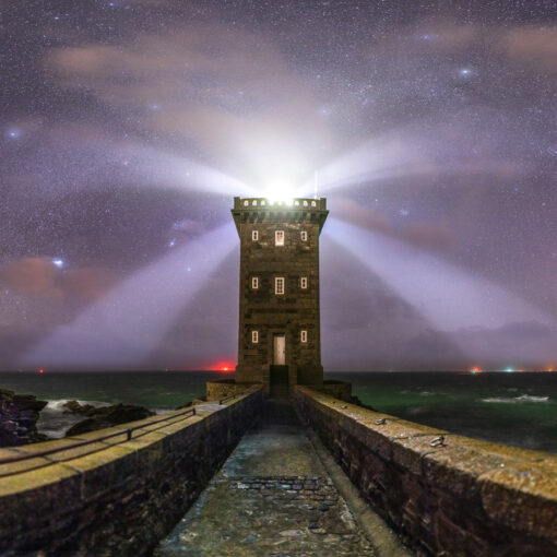Le phare de Kermorvan est le dernier rempart avant l’hostilité de l’océan ! Le ciel est piqué de millions d’étoiles grace à la présence de la Voie lactée qui traverse les constellation d’hiver.