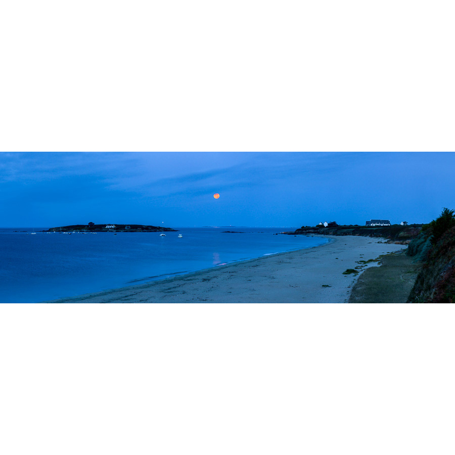 Installé à l’extrêmité est de la Plage de Tahiti à Névez, j’immortalise le coucher de la Pleine Lune dans l’axe de l’Archipel des Glénan, avec à gauche l’Île de Raguénez.