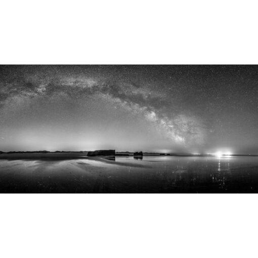 Les blockhaus de la plage de Tréguennec ne sont plus que des masses sombres échouées. Ils gisent sous l’arche de la Voie lactée. Tout à droite, les deux lumières jaunes sont le phare d’Eckmühl et le port de Saint-Guénolé. Le sable étant recouvert d’une pellicule d’eau, les étoiles se réfléchissent à sa surface.