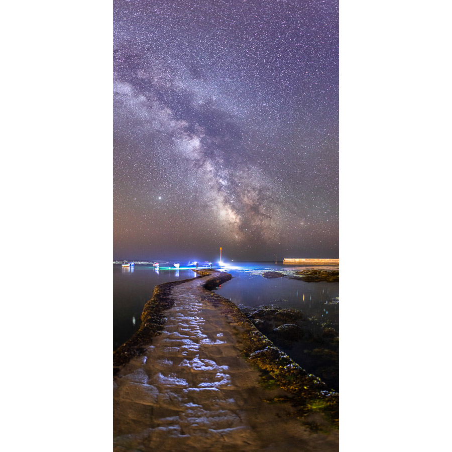 La cale de Saint-Pierre nous mène à prendre notre envol parmi les étoiles de la Voie lactée qui est superbe face à l’océan. Des pêcheurs qui s’affairent au bout de la cale éclairent efficacement le premier plan qui gagne en contraste et relief.