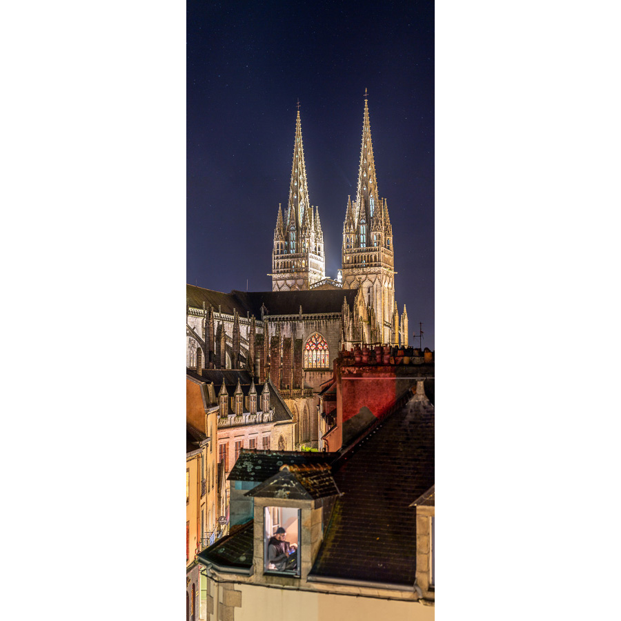 Je profite du passage de la comète Tsuchinshan-ATLAS plein ouest (juste à gauche de la flèche de droite sur la photo) pour faire une photo depuis une terrasse qui offre une incroyable vue sur la Cathédrale Saint-Corentin et la rue du Frout. Une personne qui regarde son smartphone depuis la fenêtre de son appartement est un vrai plus pour cette photo. La comète est peu visible à cause de la pollution lumineuse de la ville de Quimper, mais la beauté du point de vue compense largement la faiblesse de l’astre.