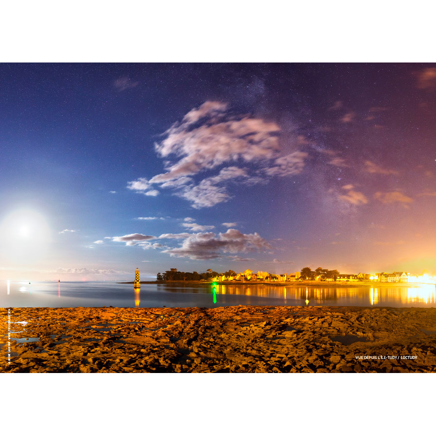 Set de table réversible « Loctudy de nuit ». Deux photos du même site sont imprimées, l’une au recto, l’autre au verso. Ces photos ont été prises de nuit ou au crépuscule afin de capturer les étoiles, la Lune, la Voie lactée, etc.